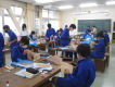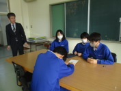 本日の3限、2学年は技術科でした。オリジナルライト(行灯)製作に向けて、構想シートを記入しているところでした。3学年は英語でした。ALTと一緒に、班で相談しながら、イラストを見て英単語のスペルを答える課題に挑戦していました。