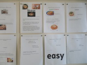 | 調理室前には、家庭科と英語科とが連携した2学年の「日本の『食』を英語で紹介する」活動で作成したレポートが掲示されています。写真等を用いて分かりやすくまとめられています。 |