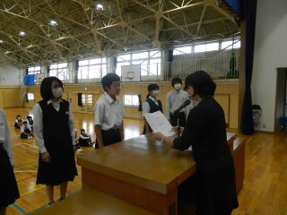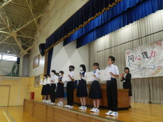 全校朝会を実施しました。校歌斉唱、校長講話に引き続き、第1回英語検定の表彰を行いました。