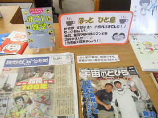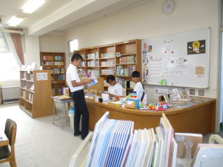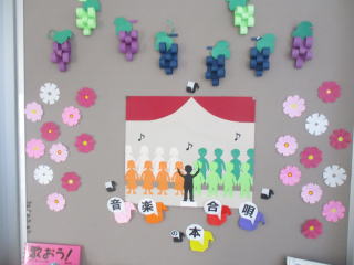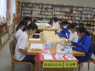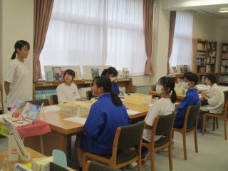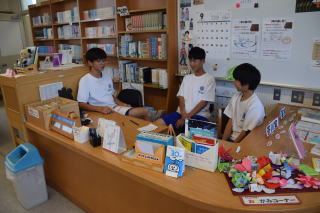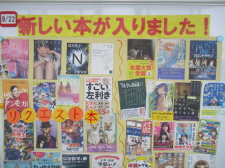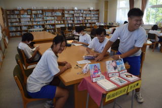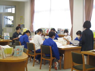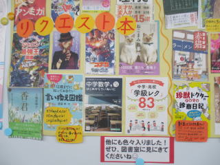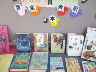 季節や学校行事にちなんで、図書室の前には、「合唱」や「音楽」をテーマにした本が特集されています。本日は市の学校図書館支援員さんの来校日