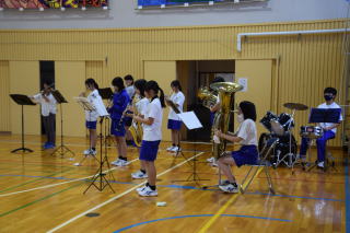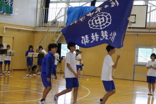駅伝部の8名の選手に、全校生徒でエールを送りました。入退場の音楽は、吹奏楽部が「ワタリドリ」を演奏しました。