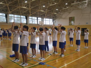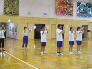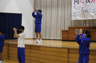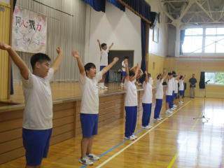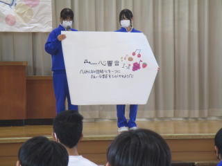 本日、生徒朝会を実施しました。各専門委員会からの連絡に引き続き、生徒会長から話がありました。その後、全校の仲を深めるレクとして