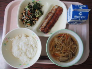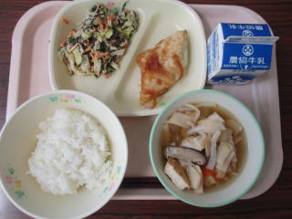 本日の献立は、【ごはん、チキンソースカツ、マヨたく和え、わかめのみそ汁、牛乳】です。
