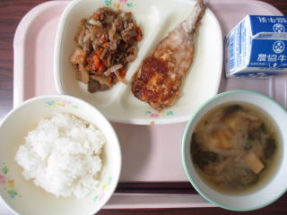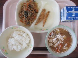 本日の献立は、【ごはん、いわしのピリ辛だれ、五目きんぴら、じゃがいもの味噌汁、牛乳】です。