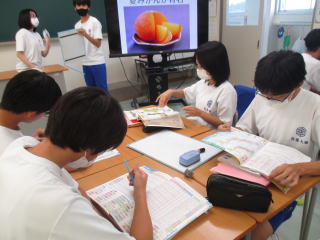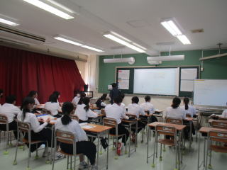 1限の1学年は数学で、1次方程式(比例式)の学習でした。比例式を利用して解く課題に挑戦していました。2学年は英語でした。Lesson6の学習で、