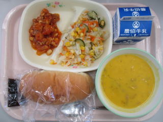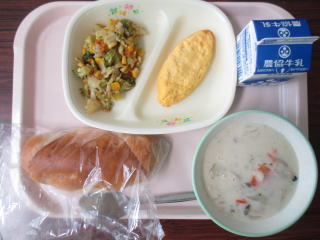 本日の献立は、【米粉アップルパン、チーズオムレツ、ブロッコリー・ソテー、きのこの豆乳クラムチャウダー、牛乳】です。