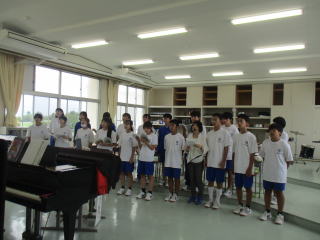の本文の内容を確認していました。3学年は音楽でした。「花」を歌唱するために発声練習をしていました。一人一人が大きな声を出していて迫力があり