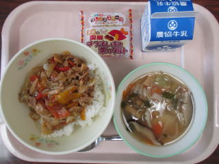 本日の献立は、【ホイコーロー丼(ごはん)、トックスープ、さつまいもと栗のタルト、牛乳】です。