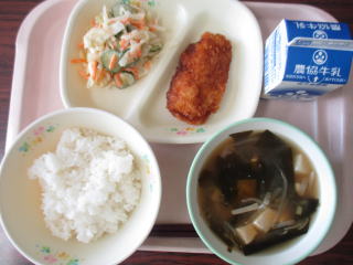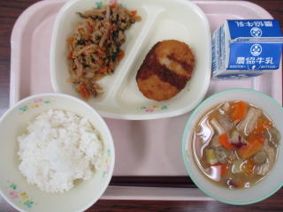 本日の献立は、【ごはん、野菜コロッケ、切り干し大根のツナ炒め、さつま汁、牛乳】です。