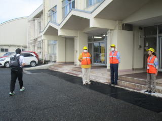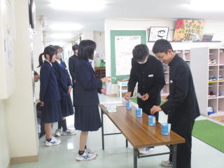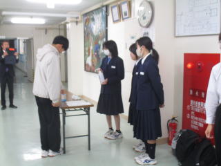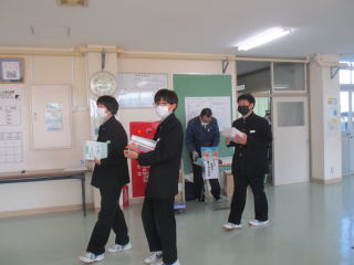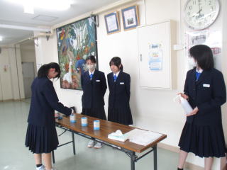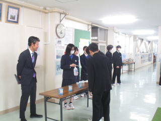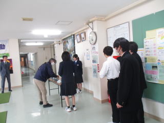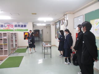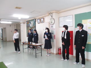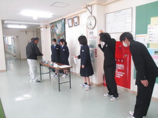 地域の民生委員・児童委員の皆様が、月に1回、生徒玄関前であいさつ運動を行ってくださっています。