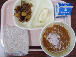 本日の献立は、【大麦面、カレー南蛮汁、さつまいもと大豆の揚げ煮、果物(りんご)、牛乳】です。