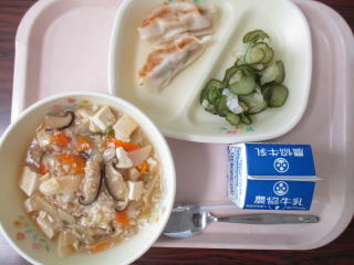 本日の献立は、【塩マーボー丼(ごはん)、餃子、やみつききゅうり、牛乳】です。