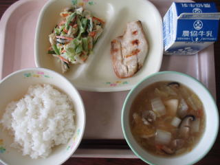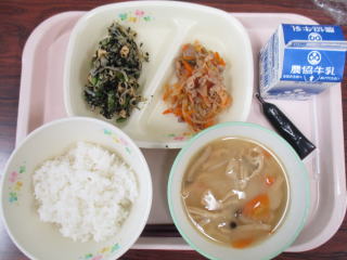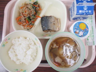 本日の献立は、【ごはん、さばの味噌煮、マヨたく和え、けんちん汁、牛乳】です。
