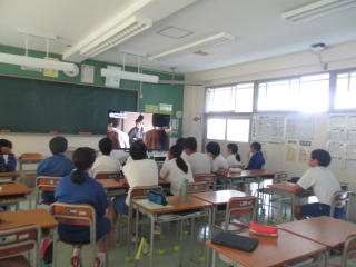とめられた動画を視聴していました。3学年は英語でした。Lesson5の本文の対話文をペアで読み合っていました。