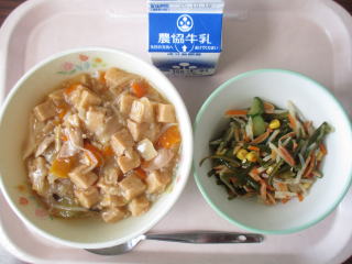本日の献立は、【厚揚げのオイスターソース丼(ごはん)、茎わかめのアーモンドサラダ、牛乳】です。