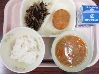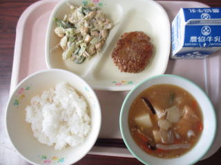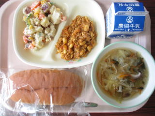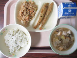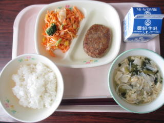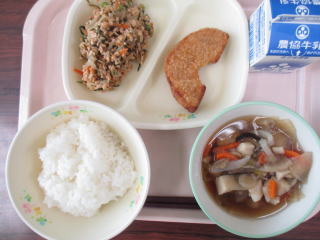 本日の献立は、【ごはん、いわしハンバーグ、ごまマヨ和え、じゃがいものそぼろ煮、牛乳】です。