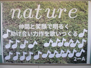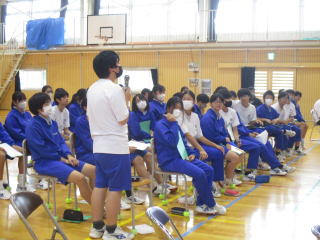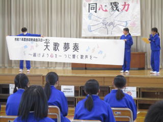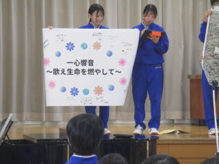 本日の6限は合唱発表会に向けた全校音楽の第1回目でした。今年度の合唱スローガンの発表や、学級スローガンの発表、校歌・全校合唱の指揮者と伴奏者の紹介、全校