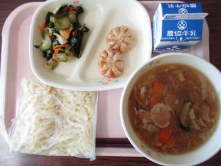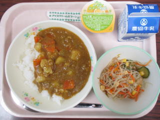 本日の献立は「猿橋小リクエスト献立」です。【ポークカレー(ごはん)、春雨サラダ、レモンシャーベット、牛乳】でした。