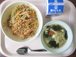 本日の献立は、【ビビンバ丼(ごはん、豚肉とキムチの炒め物、切り干し大根のナムル)、わかめと卵のスープ、牛乳】です。