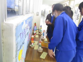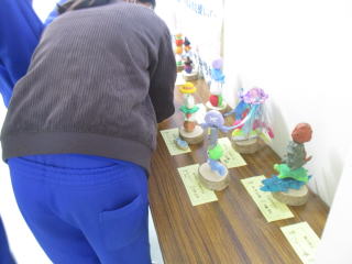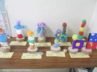 9月30日に彩色をした陶芸作品が出来上がってきました。早速、作品札を付けて、職員玄関前に展示しました。