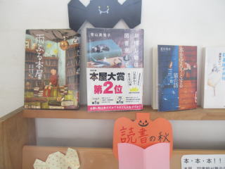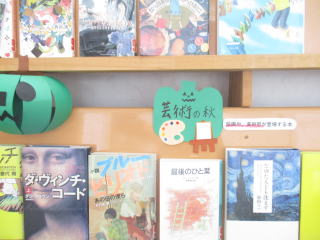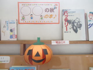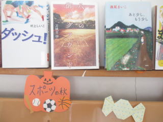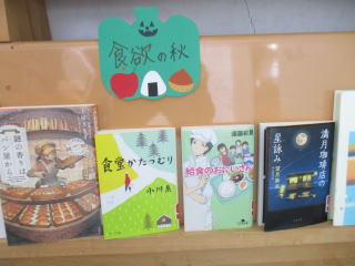 図書室前の掲示コーナーが新しくなり、「〇〇の秋」にちなんだ本が展示されています。「読書の秋」「スポーツの秋」「芸術の秋」「食欲の秋」など、今の時期に