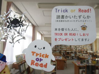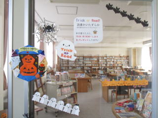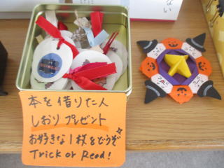 10月も後半に入り、ハロウィンが近づいてきました。学校図書館支援員さんによる図書室の飾りつけも、ムードを盛り上げています。本を借りた人に、「Trick