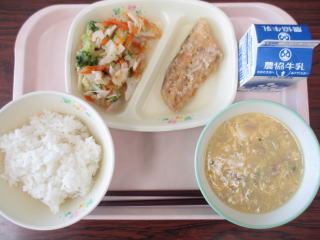 本日の献立は、【ごはん、白身魚のねぎ塩ソースかけ、れんこんサラダ、卵コーンスープ、牛乳】でした。