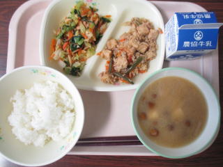 本日の献立は、【ごはん、厚揚げの肉みそ炒め、アーモンドびたし、なめこ汁、牛乳】です。