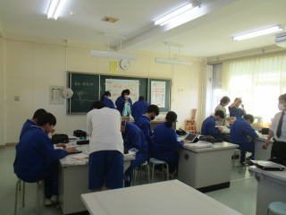 バック」づくりを頑張っていました。3学年は英語でした。Lesson7のReading Lesson2の本文「Bus Boycott」の本文の内容を確認していました。