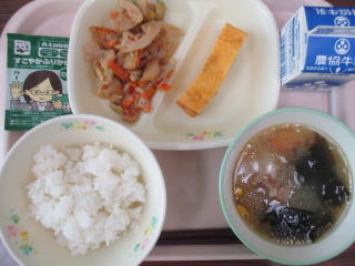 本日の献立は、【ごはん、のりふりかけ、五目玉子焼き、れんこんきんぴら、どさんこ汁、牛乳】です。