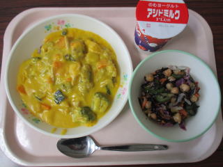 本日の献立は「入学・進級お祝い献立」で、【ポークカレーライス、こんにゃくサラダ、お祝いイチゴクレープ、牛乳】です。