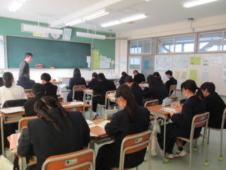 本日の3限、1学年は数学、2学年は理科でした。両クラスとも、テスト勉強に励んでいました。3学年は音楽でした。合唱発表会の振り返りをした後、「COSMOS」の歌唱