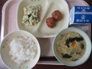 本日の献立は、【ごはん、肉団子の甘酢あん、まめまめサラダ、中華卵スープ、牛乳】です。