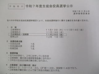 昼の放送で、選挙管理委員長から生徒会役員選挙についてに説明があり、放課後、生徒玄関に詳細が掲示されました。テストもあり忙しいとは思いますが、ぜひ多く