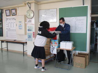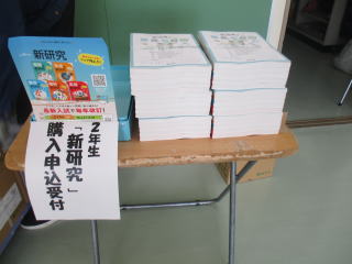 本日の朝、生徒玄関にて、2学年を対象とした受検用教材の販売がありました。新しい学習教材を手に、嬉しそうな2年生の姿が見られました。