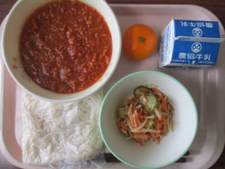 本日の献立は、【ソフトめん、ツナトマトソース、シャキシャキアーモンドサラダ、みかん、牛乳】です。