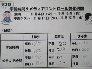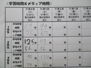 今週からテスト前諸活動停止期間に入っています。生徒玄関前には、各学年ごとの家庭学習時間とメディア時間の集計表が掲示されており、昼の放送で集計結果が発表さ