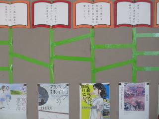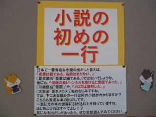 学校図書館支援員さんが、その時期に合った飾りつけ・掲示で、読書意欲を喚起してくださっています。今回も、本の書き出しの一行から興味・関心を高めようとするコー